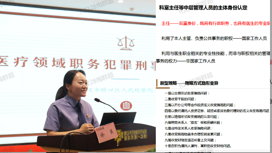 会议特邀武汉市硚口区人民检察院第二检察部徐英检察官,以《医疗领域职务犯罪刑事风险与防范》为题,以“身边事”警醒“身边人”,从医疗领域职务犯罪案例、职务犯罪成因分析和职务犯罪防范三个方面向党员领导干部讲授一堂具有鲜明医疗行业特点的纪法专题讲座,讲座内容通俗易懂,典型案例贴合实际,让在座的党员干部深刻认识到腐败行为代价之大、成本之高、危害之深,也让大家明白作为党员干部、医务人员的双重身份,需要时刻牢记肩负的责任和担当,更需要始终保持清醒头脑、紧绷法纪之弦。