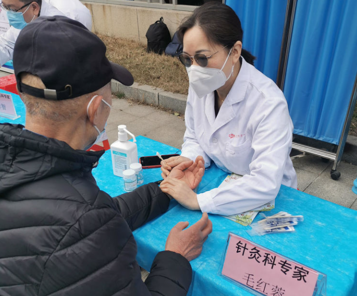 针灸科主任医师毛红蓉将中医针灸、拔罐技术带入社区,为头晕、耳鸣、腰痛的居民针灸理疗。