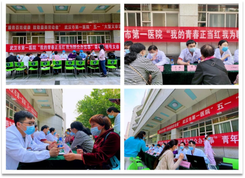 5月4日上午9时,劳动节假期中,青年节当天,市第一医院心血管内科、消化内科、老年病科、创面修复与周围血管科、皮肤科等11个青年文明号的青年医务工作者在门诊组团亮相,为英雄的武汉人民义诊,向最美的劳动者致敬。