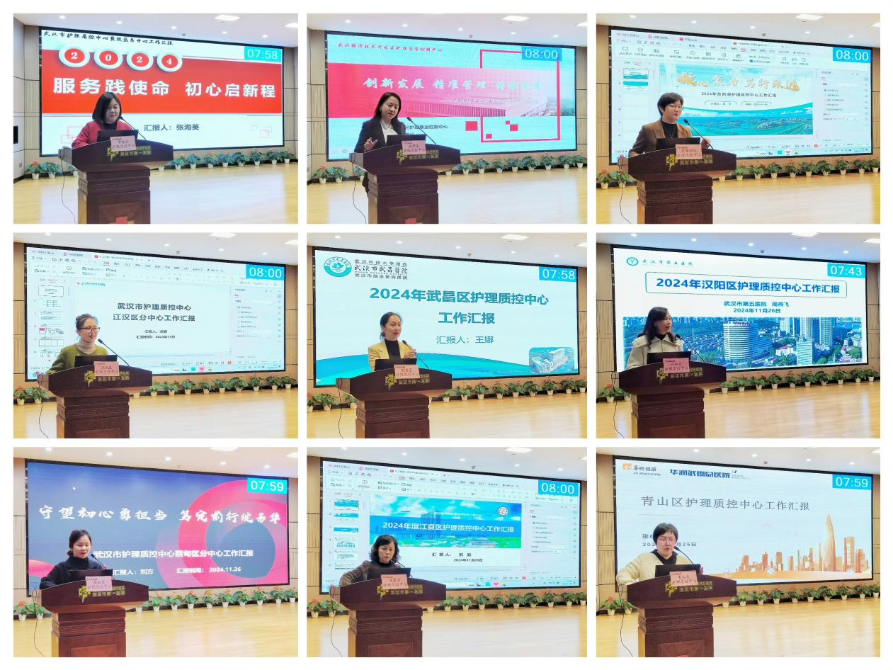 在区级护理质控中心工作汇报评选环节,张海英、李素云、黄雯等9位区级质控中心主任对标质控计划和重点任务,从工作开展情况、存在问题及下一步工作计划三个方面,依次对各区级护理质控中心的工作进行汇报。武汉市护理质控中心主任王莉,副主任刘新文、罗蔓、冯静、鲁铭、许琍文及省部级医院专家刘于、鲜于云艳、张春华主任等9位评委从组织建设、质量控制、区级网络、培训工作、创新工作、信息平台、参与工作、区级护理工作质量等维度进行考核评分,最终武昌区、经开区、青山区、江夏区、江汉区护理质控中心荣获2024年度优秀区级护理质量控制中心称号。