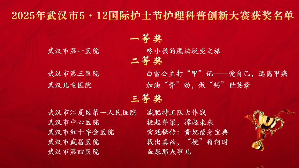 在第114个国际护士节来临之际,为赓续南丁格尔精神,彰显新时代护理工作者使命担当,贯彻落实《国务院办公厅关于加强护士队伍建设优化护理服务的指导意见》文件精神,全面构建护理科普创新发展新格局,武汉市护理质量控制中心在市卫健委指导下,2025年4月16日,在武汉市第一医院举办了2025年武汉市5·12国际护士节护理科普创新大赛暨2025年武汉市护理质量控制中心工作推进会。