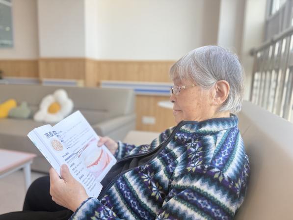 在老年医学科的病区里,护士设计师们埋下了精妙的"记忆触发器":关于认知障碍病区,琳琅满目的书籍、报纸,充分迎合着老一辈年带里的文学,同时穿插着医护护工作人员的学习园地;安宁疗护病区的走廊上,有护士与家属们为患者种植的象征生命力的花草,并且为他们布下了可实现文字记录的“小王子明星片”;老年营养及中医药病区的休闲角落里,营养护士携手中医师为患者布置了模型宣教区及节气养生茶,为远道而来的您提供一处小憩之地。在这些角落的背后,是一群美丽的白衣天使们在用心、用行动谱写人文关怀的笔触。