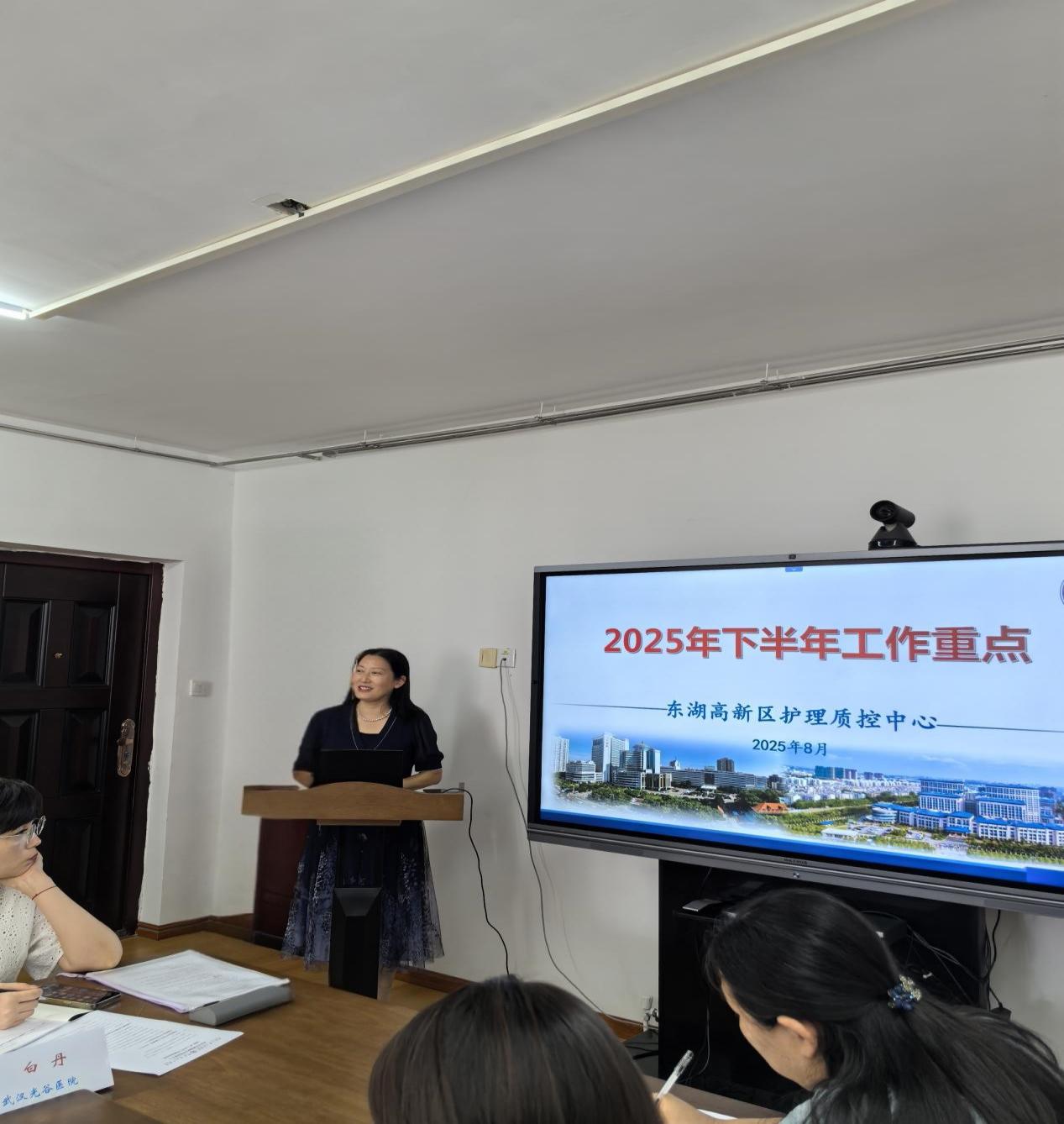 为全面总结2025年上半年全区护理工作成效,交流分享工作经验,部署下半年工作重点,进一步提升东湖高新区护理服务质量和管理水平,7月31日下午,东湖高新区护理质控中心上半年工作座谈会在武汉大学人民医院东院(光谷院区)成功举办。东湖新技术开发区卫生健康局郭祖德科长、武汉大学人民医院东院分党委书记鲜于云艳、华中科技大学同济医学院附属同济医院光谷院区护士长李婷、湖北省妇幼保健院光谷院区护理督导胡永群、武汉大学口腔医院光谷院区护士长王媛媛、武汉市第三医院光谷院区护理骨干田欢欢及13家社区医疗机构代表出席本次会议。武汉大学人民医院护理部副主任兼东院护理办主任文丽主持会议。