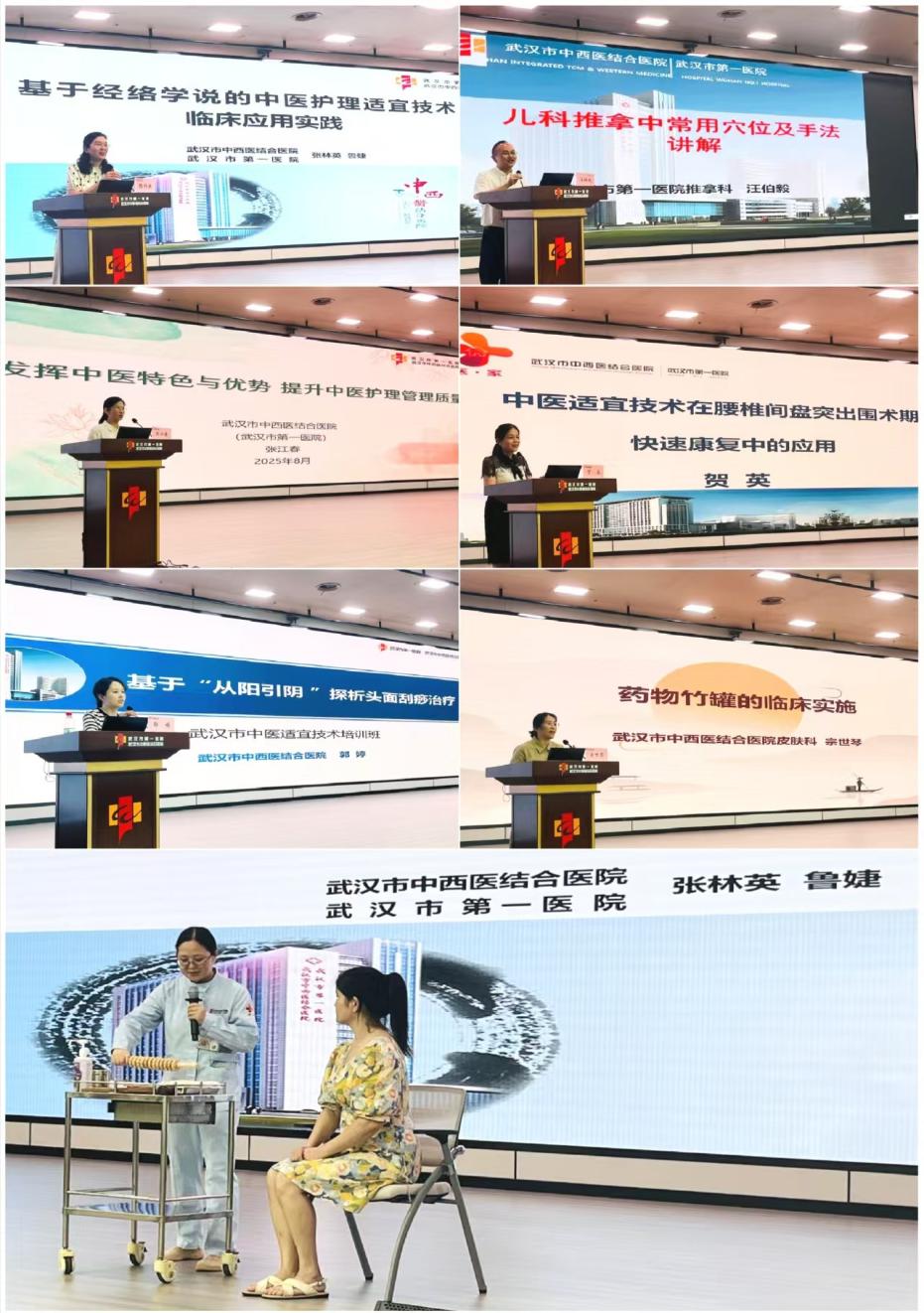 武汉市中西医结合医院张林英副主任、推拿科组长汪伯毅医生、总护士长张江春、骨科护士长贺英、消化内科护士长郭婷、皮肤科护士长宗世琴分别为大家展示了《基于经络学说的中医护理适宜技术临床应用实践》、《儿科推拿中常用穴位及手法讲解》、《发挥中医特色与优势 提升中医护理管理质量》、《中医适宜技术在腰椎间盘突出围手术期快速康复中的应用》、《基于“从阳引阴”探析头面刮痧治疗》、《药物竹罐的临床实施》,通过图片、视频和实操示范相结合的方式,系统讲解了中医疗法的临床实践应用、机理功效、操作手法及常用穴位的选择等,令学员深受启发。