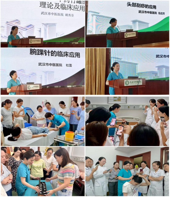 武汉市中西医结合医院总护士长张江春、汪伯毅医师及护士长宗世琴、贺英、郭婷分别以《发挥中医特色与优势提升中医护理管理质量》、《儿科推拿中常用穴位及手法讲解》、《药物竹罐的临床实施》、《中医适宜技术在腰椎间盘突出围手术期快速康复中的应用》、《基于“从阳引阴”探析头面刮痧治疗》为题,结合各自领域的典型病例和实践经验,深入浅出地进行了讲解和展示。