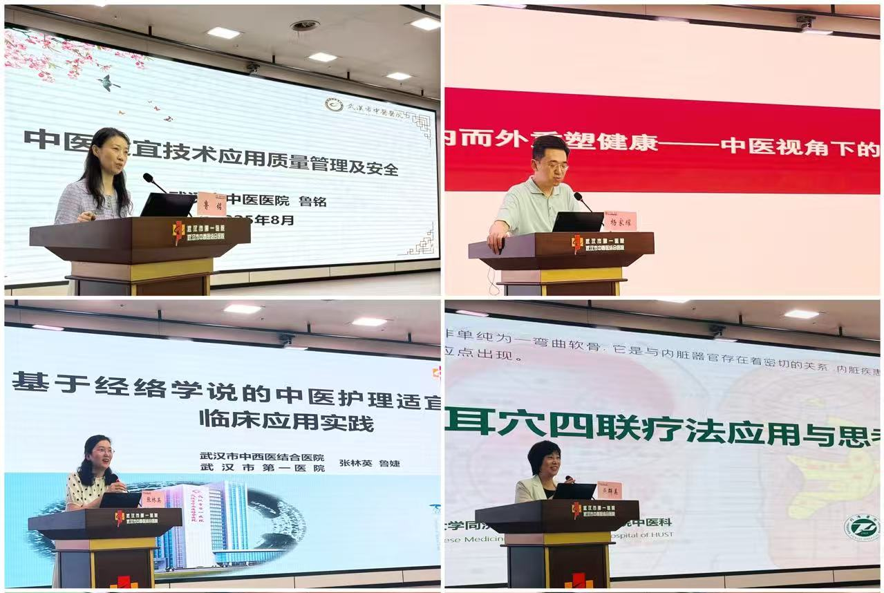开班仪式结束后进入中医经典理论授课环节,由武汉市中医医院护理部主任鲁铭、华中科技大学同济医学院附属同济医院副主任护师燕群美、武汉市中西医结合医院护理部副主任张林英、名医堂主任杨家耀分别以《中医适宜技术应用质量管理及安全》、《耳穴四联疗法应用与思考》、《基于经络学说的中医护理适宜技术临床应用实践》、《从内而外重塑健康--中医视角下的科学减肥之道》为题分享了中医特色适宜技术应用的宝贵经验。