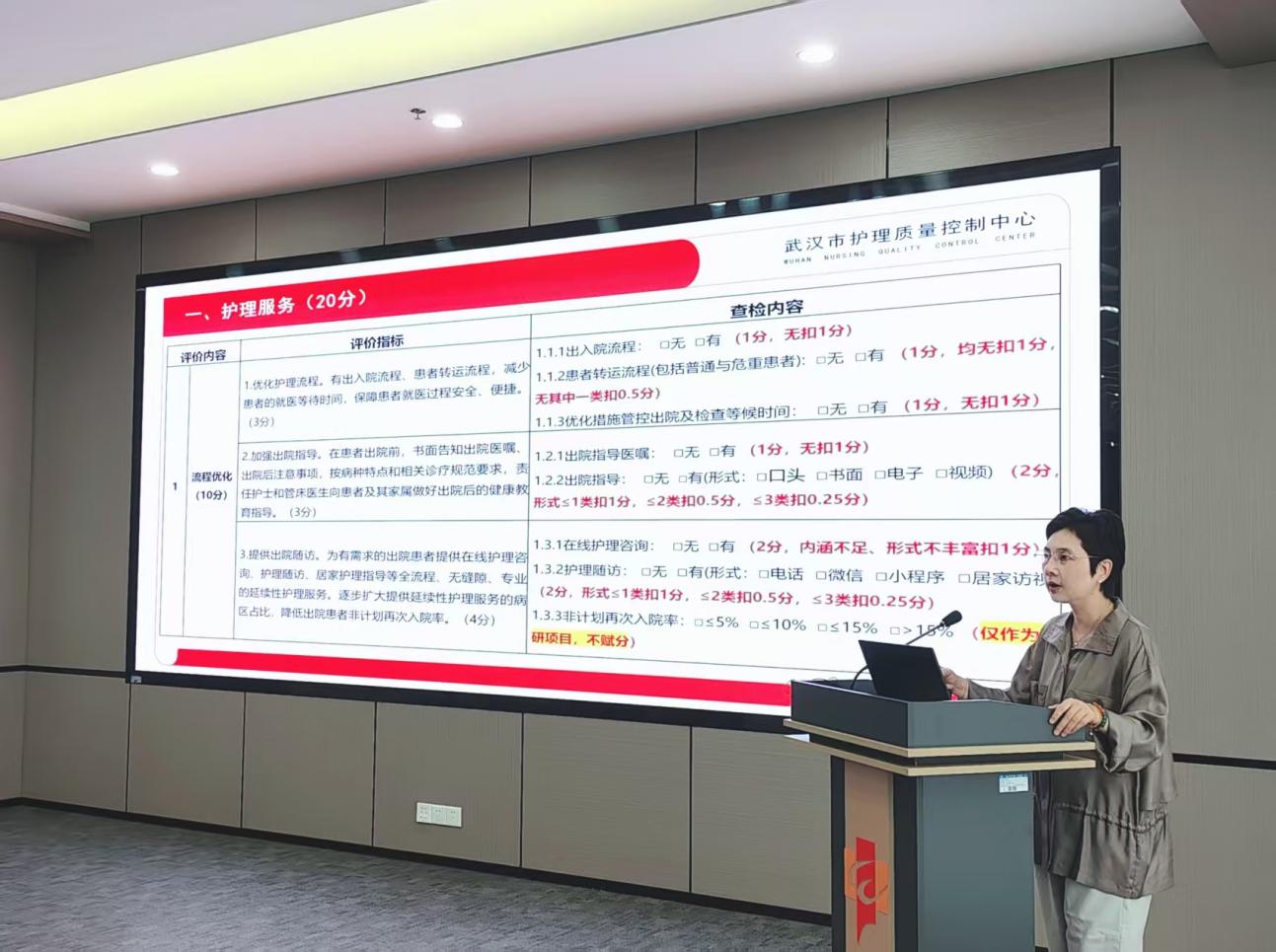 9月22日上午,武汉市护理质量控制中心在武汉市第一医院内科楼召开2025年武汉市落实改善护理服务行动计划专项护理工作评估调研专家培训会,质控中心主任王莉从整体要求、查验评分表评估、满意度调查和反馈填写四个部分进行了详细介绍,主要围绕市护理质量控制中心制定的《2025年武汉市落实改善护理服务行动计划专项护理工作评估调研评价查检评分表》,系统解读了调研内容与评分细则。她强调,评估结果应全面反应三年护理改善行动的成果、问题及改进方向,确保数据真实、过程规范。