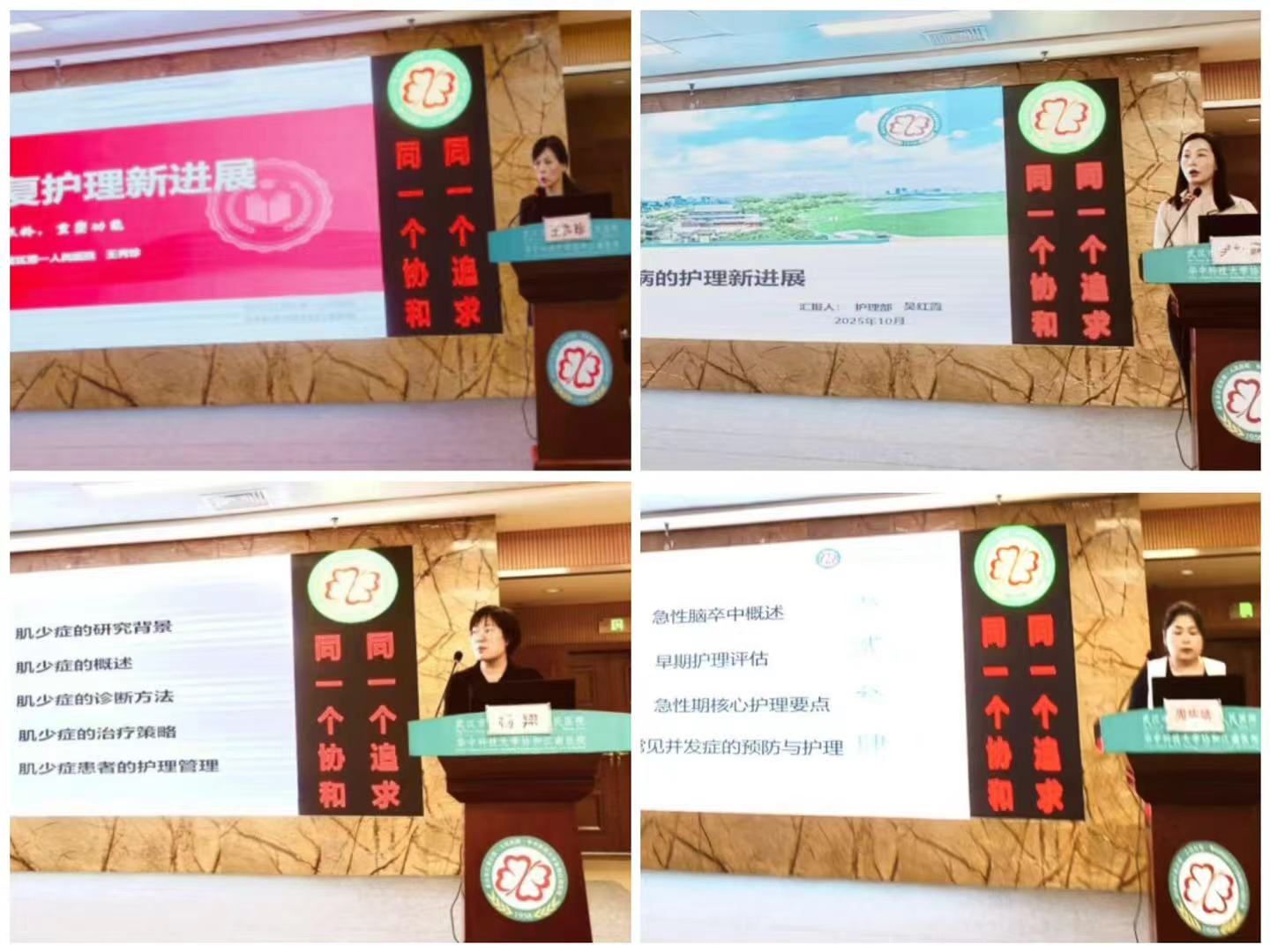 江夏区护理质控中心主任主任王秀珍在专题报告《老年病康复护理新进展》中,介绍老年常见病康复护理前沿理念与技术,强调多学科协作与功能导向性训练的重要性。江夏区第一人民医院护理部总护士长吴红霞以《老年冠心病的护理新进展》为题,阐述老年冠心病护理新进展,提供医院—社区—居家三阶段康复指导。江夏区第一人民医院护理部总护士长杨翔以《老年肌少症的护理与干预》为主题,突出运动与营养干预的重要性。江夏区第一人民医院神经内科一病区护士长周华婧在《脑卒中急性期早期护理与并发症预防》中,调脑卒中“黄金时间窗”内早期评估与干预的关键作用。