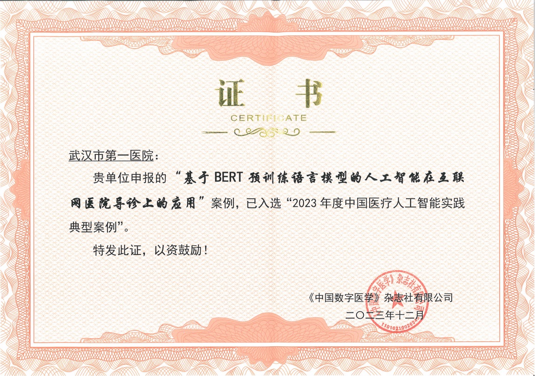 2023年12月22日,荣获中国数字医学《2023年度中国医疗人工智能实践典型案例》