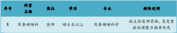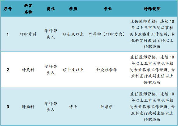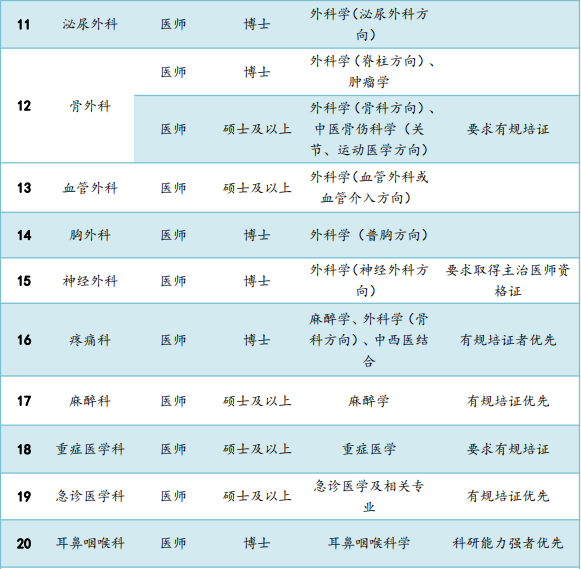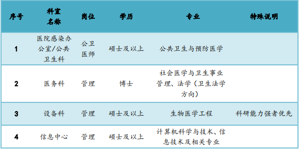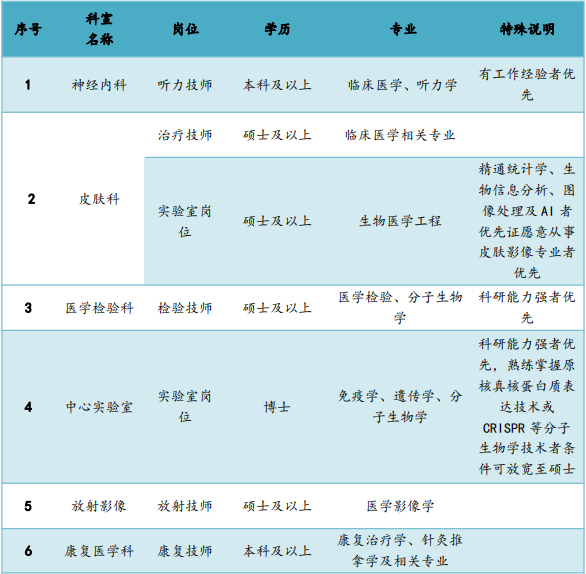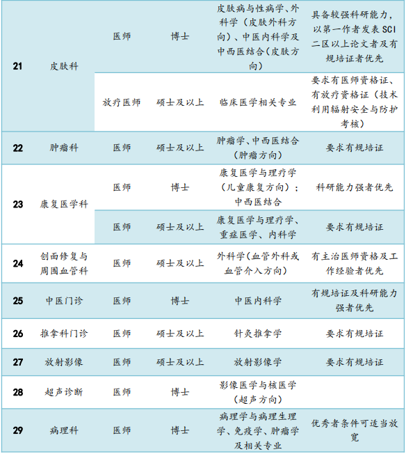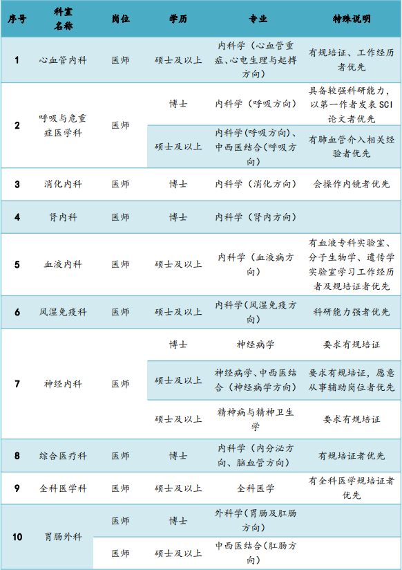(3)优先录用博士、具备三甲医院相关工作经历者,临床8年制博士可不受专业限制,应聘各科室;