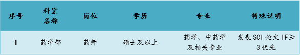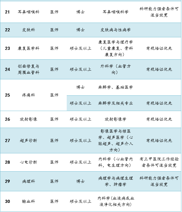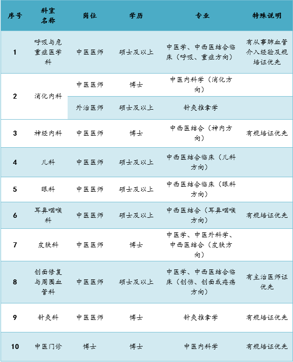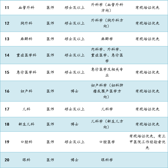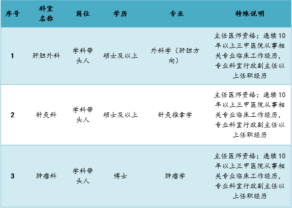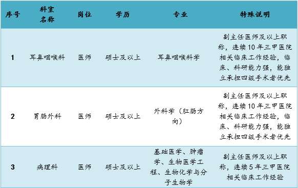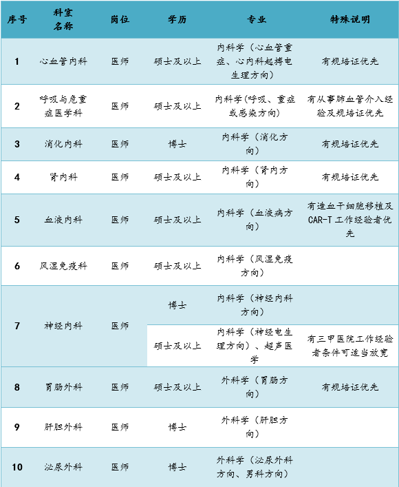 (3)优先录用博士、具备三甲医院相关工作经历者,临床8年制博士可不受专业限制,应聘各科室;,