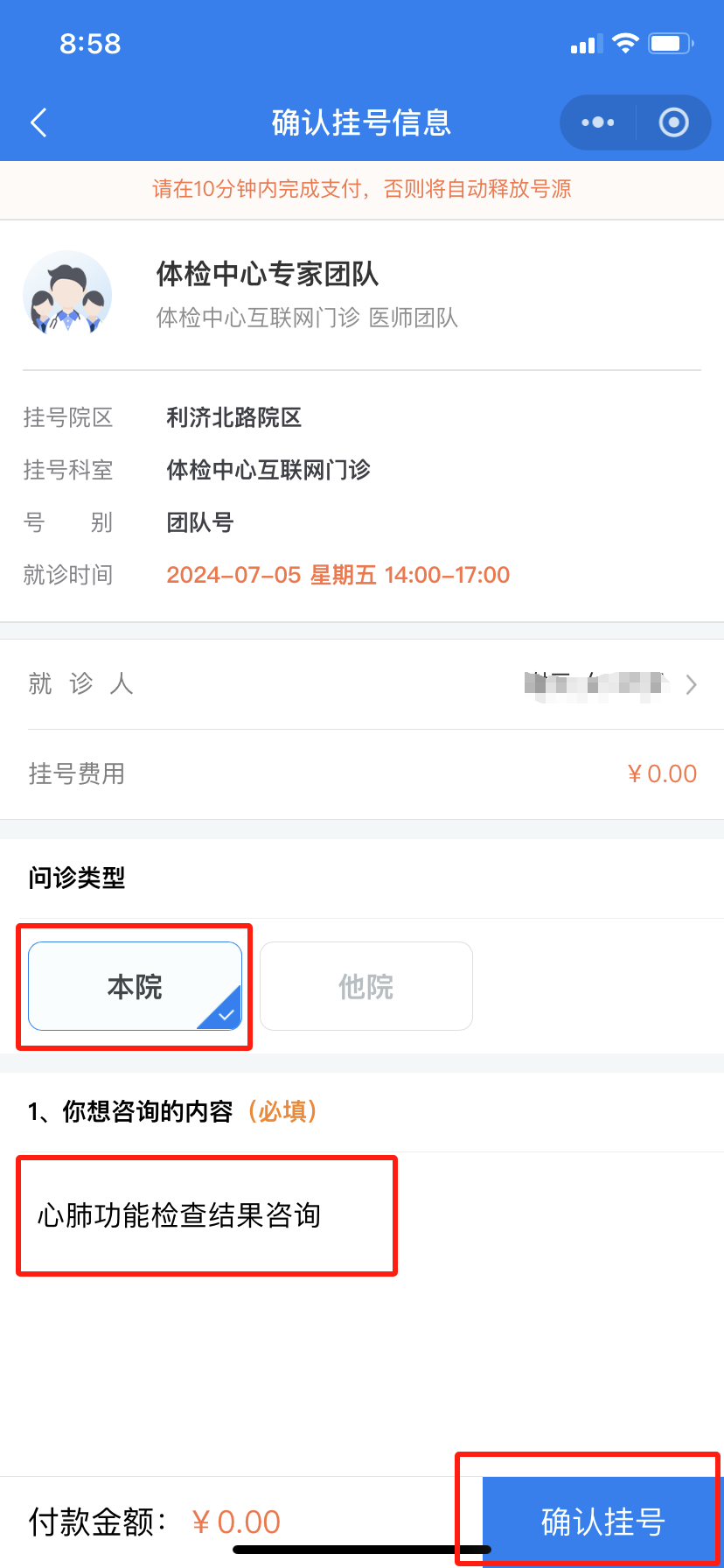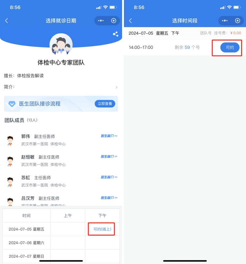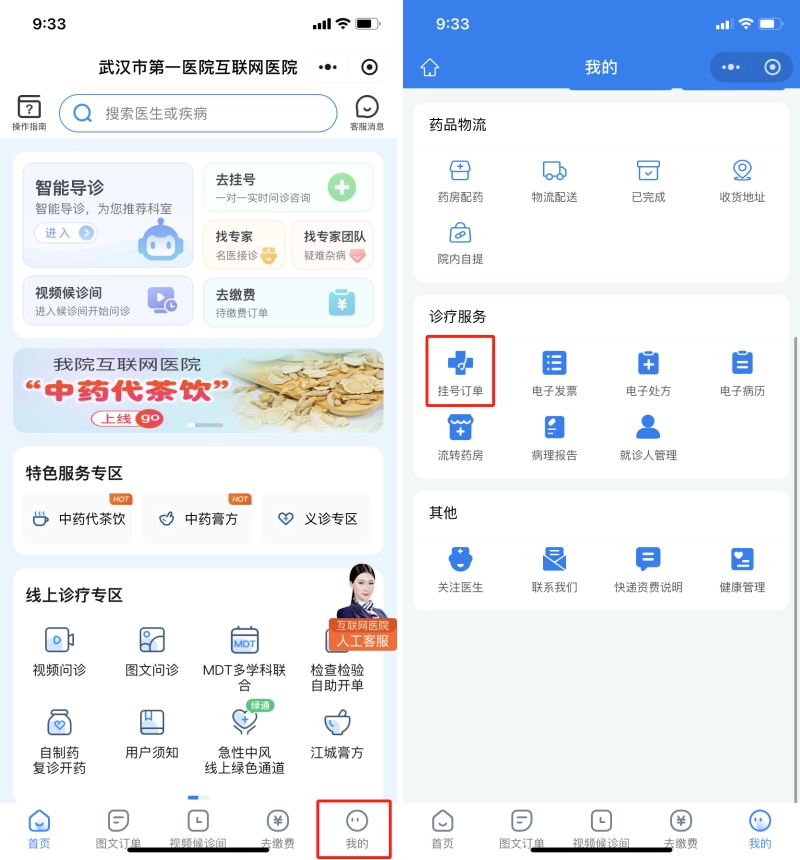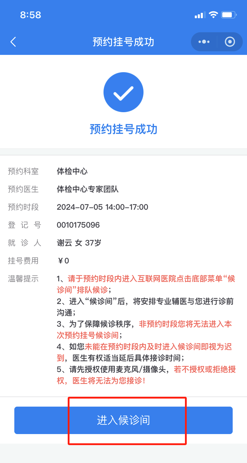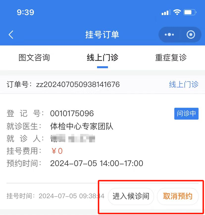 备注:再次进入体检咨询入口可进入武汉市第一医院患者端——我的——挂号订单——进入候诊间或取消预约