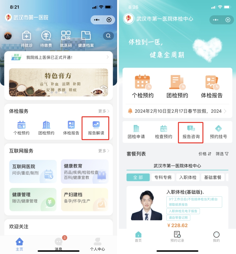 线上可关注“武汉市第一医院健康体检(小程序)”,进入查看体检报告后,在互联网医院上进行报告解读(见图),由专家线上一对一咨询,线下有专家坐诊健康管理门诊,一对一讲解报告内容,做出准确的健康评估及疾病风险预测,权威把关。