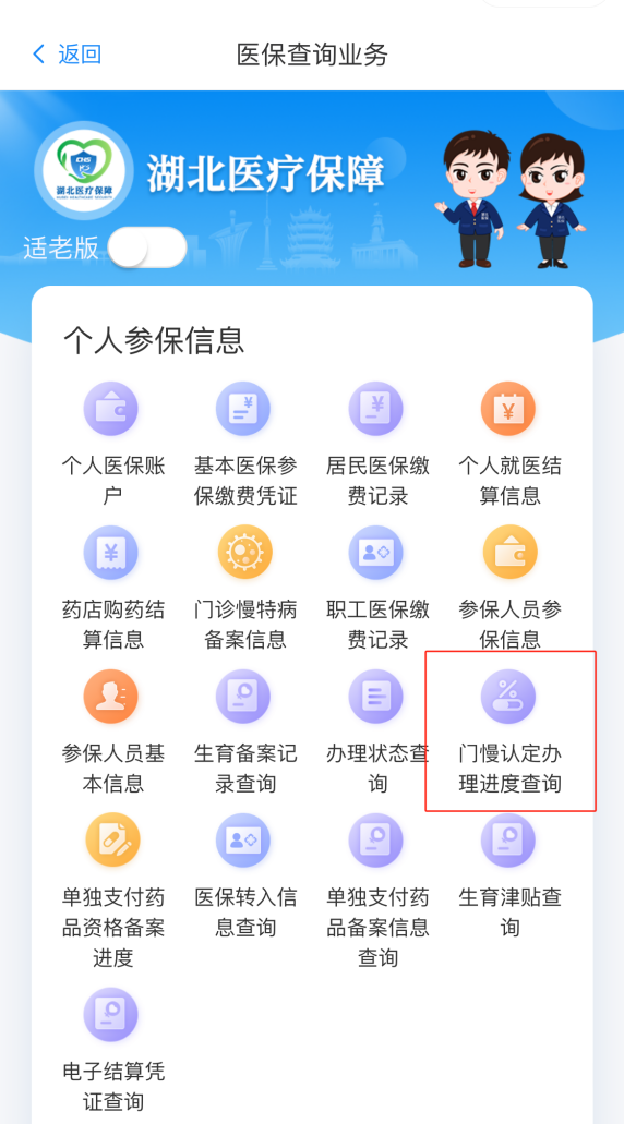 审批进度可通过“湖北医疗保障”小程序进行查询,在首页点击“我要查”,然后点击“门慢认定办理进度查询”选项。