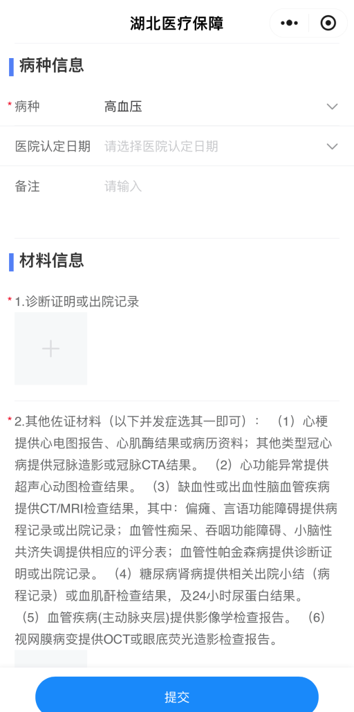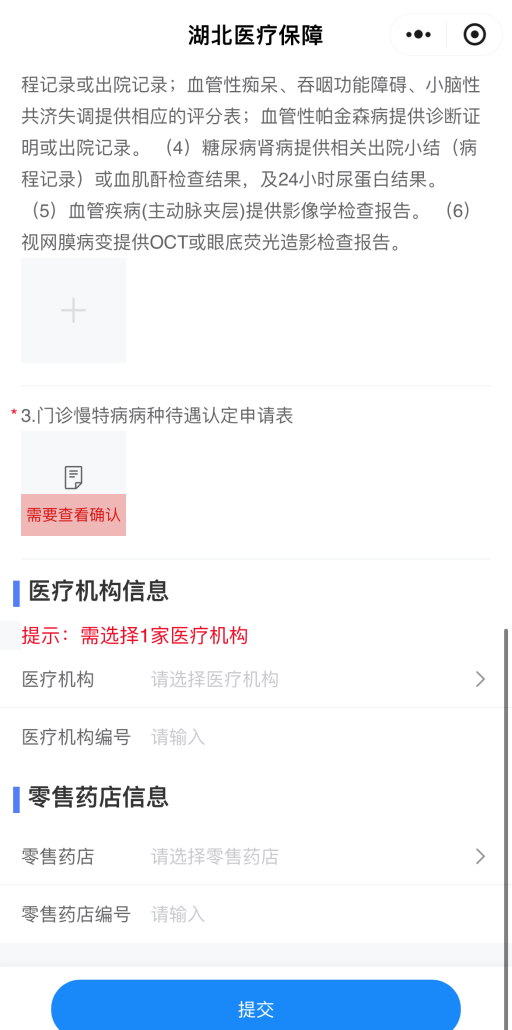 填写参保人基本信息,选择需要申请的病种,按照要求上传相应材料(其中门诊慢特病病种待遇认定申请表由系统根据申请信息自动生成,无需重复填写,点击查看确认即可),选择一家门诊慢特病定点医疗机构(二级及以上)作为首诊和复诊医疗机构,一家门诊慢特病定点零售药店作为购药机构,提交后等待审批。