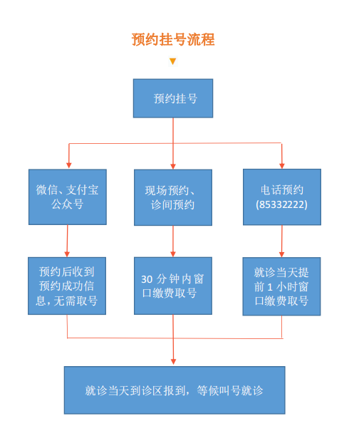2、电话预约在就诊当天(至少就诊前1小时)到门诊挂号收费窗口缴费取号,逾期作废;现场及诊间预约在预约缴费时即取得挂号单,就诊当天按时到达候诊区,逾期作废;