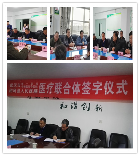 1月5日上午9:30,武汉市第一医院与团风县人民医院医疗联合体签约仪式在团风县人民医院内科楼7楼会议室举行。团风县卫生和计划生育局姚小彦副局长、胡亚双股长及团风县人民医院领导班子参加,我院纪委书记韩斌、肝胆外科主任龚昭、骨外科副主任医师徐礼森、社会服务部主任郑彦俊等参加了签约揭牌。签约仪式由团风县人民医院副院长徐志宏主持。